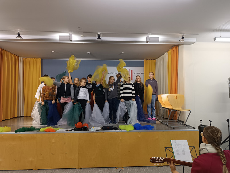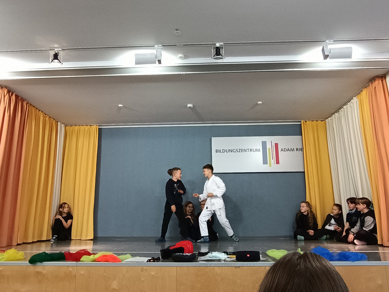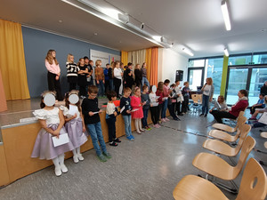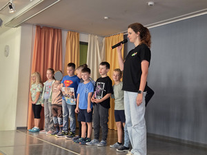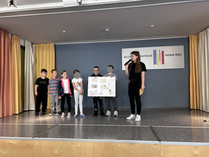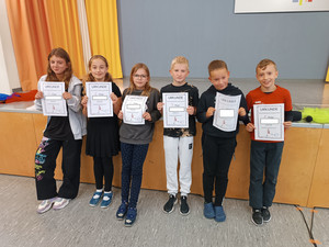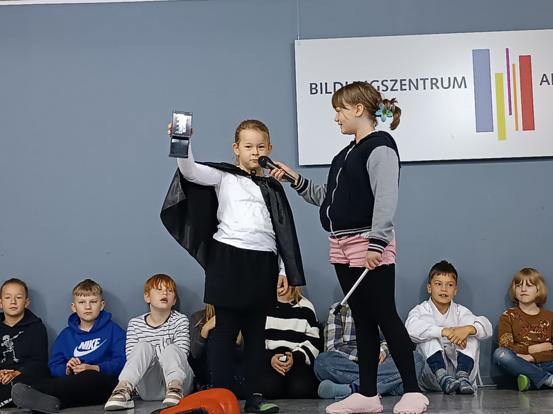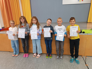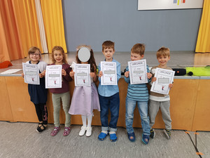 J. aus der Klasse 4b begrüßte alle Anwesenden zum Aulatreff auf Ukrainisch. Die Vierer lasen "Die verflixte Rechenaufgabe" von Otto mit verteilten Rollen und einige Kinder stellten ihre Hobbys vor. Es waren Karateübungen, eine Zauberei, ein Cheerleader-Tanz und Boxen dabei. Außerdem sahen wir Fotos und hörten einen Bericht von der Klassenfahrt. Frau Sonnemann führte die Siegerehrung des Crosslaufs durch. Stolz präsentierten alle platzierten Schüler und Schülerinnen ihre Urkunden. Zum Schluss ging wieder eine "Happy Birthday" an unsere Geburtstagskinder und der Chor sang unser Schullied.
