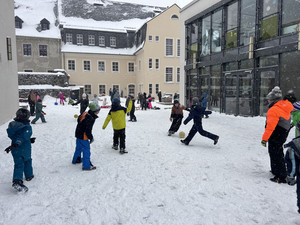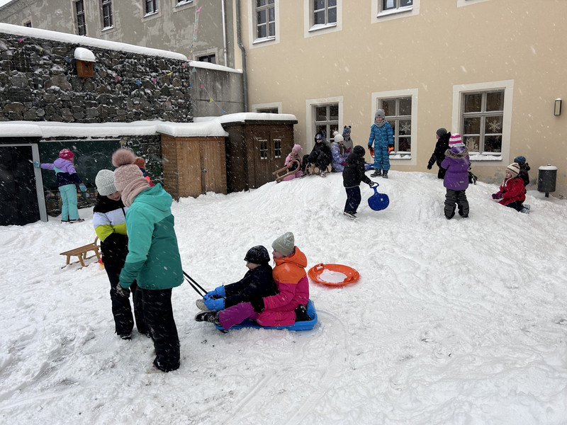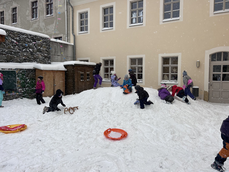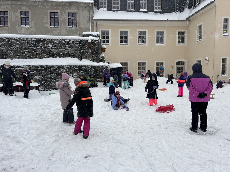Gut ausgegestattet mit Schlitten oder Porutscher kamen die Kinder früh in die Schule. Witterungsbedingt musste der winterliche Ausflug auf den Pöhlberg oder an den Schutzteich aber leider ausfallen. Dennoch hatten die Kinder an diesem Freitag ihre Freude beim Toben und Spielen im Schnee auf dem Schulhof.