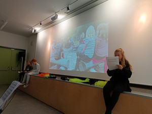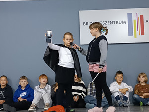 Gespannt warteten alle Kinder auf die Bekanntgabe der Platzierten. Einen ganz tollen 2.Platz mit dem Märchen "Der dicke fette Pfannkuchen" erreichte die Klasse 4a vom Bildungszentrum gemeinsam mit ihrer Kunstlehrerin Frau Ruttloff. Die Freude war riesengroß und außerdem wurde ein Zuschuss für die Klassenkasse und eine (Holz)Eule überreicht.