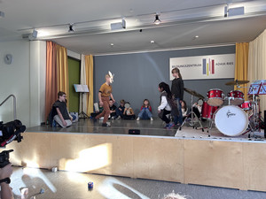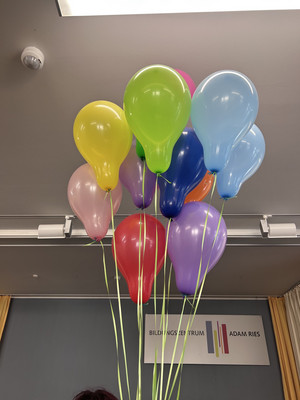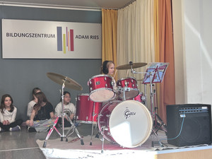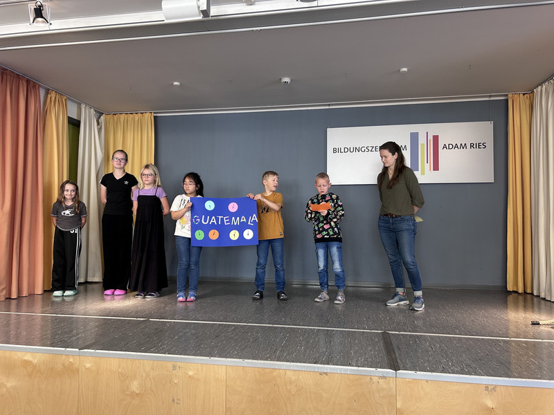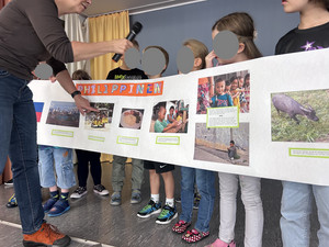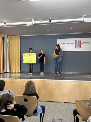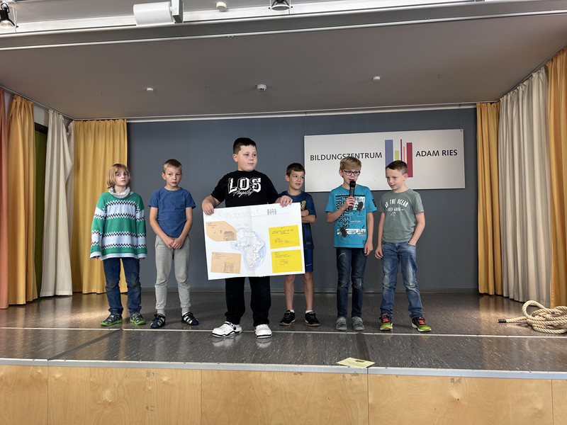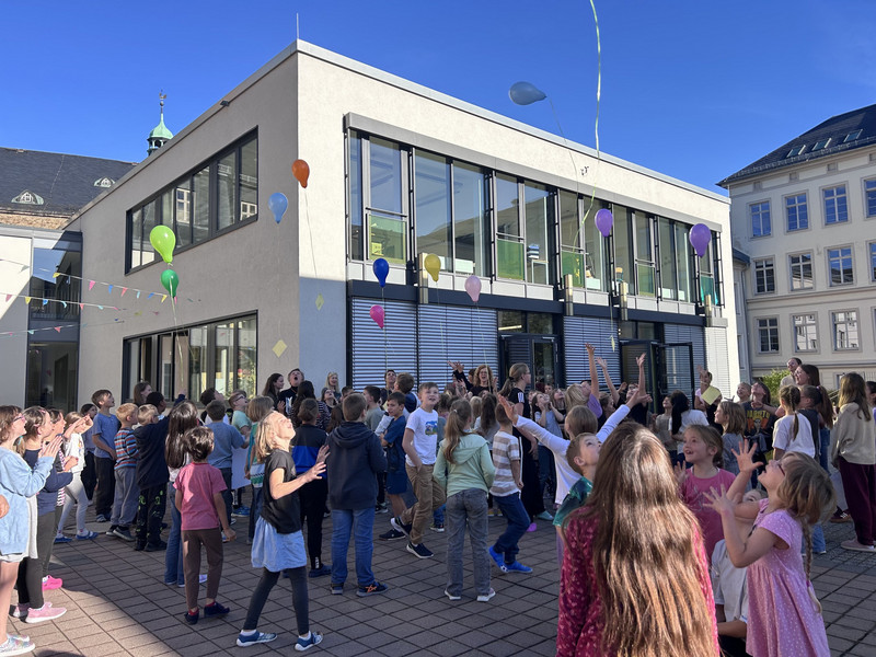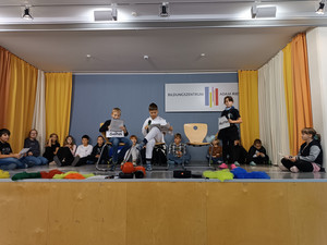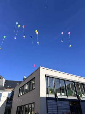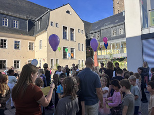 Zur Präsentation fanden sich alle Gruppen in der Aula ein und zeigten ihre Ergebnisse. Symbolisch ließ dann auf dem Schulhof jede Gruppe einen bunten Ballon steigen, um zu verdeutlichen, dass Demokratie ganz besonders auch für die Kinder wichtig ist.