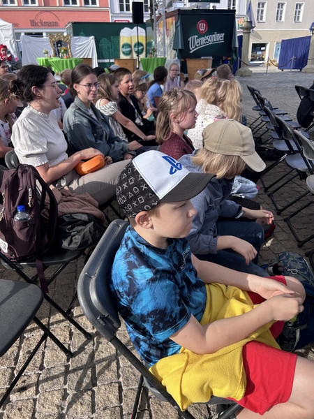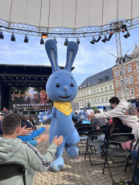 Zur Preisverleihung des Schulwettbewerbs versammelten sich viele Grundschul-, Oberschul- und Gymnasialklassen auf dem Marktplatz. Ben und das Kikaninchen führten unterhaltsam durch das Programm.
