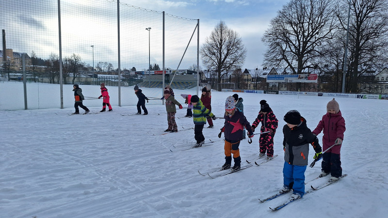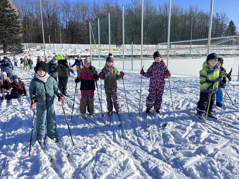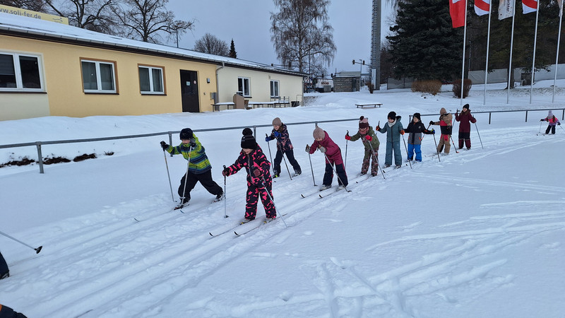Nach einigen Jahren ohne ausreichend Schnee startete die erste Schulwoche im neuen Jahr gleich mit richtig guten Bedingungen für den Skilanglauf. Bei Kaiserwetter am Dienstag und Mittwoch probierten sich die teilnehmenden Kinder im Skifahren. Nachdem die Skier erfolgreich angeschnallt waren, konnte es losgehen. Nach der Erwärmung und einigen Skigewöhnungsübungen drehten alle Kinder schon ihre ersten Runden auf dem Sportplatz und hatten so ein tolles Erfolgserlebnis. Die nächsten beiden Tage nutzen wir auch noch für den Wintersport.