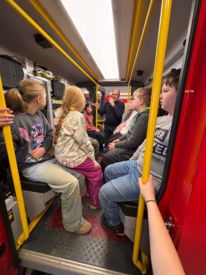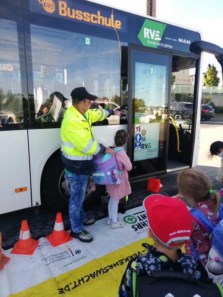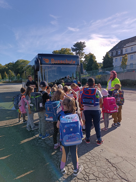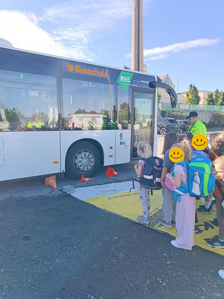 Heute ging es für die Klassen 1a/1b zur Busschule auf den Kätplatz. Hautnah konnten die Kinder erleben, wie man sich im Bus und an der Haltestelle verhält, welcher Platz der unsicherste ist und was bei einer Gefahrenbremsung passiert, wenn man sich nicht festhält. Ein kleines Geschenk gab es auch - einen Regenschutz für den Ranzen, ein Malbuch und ein Memory. Danke!