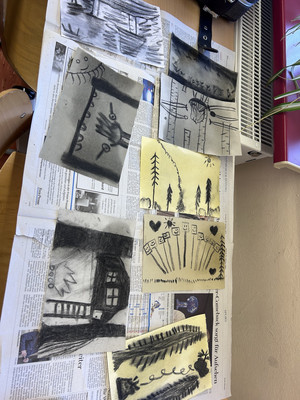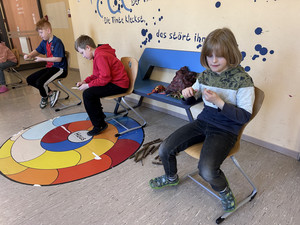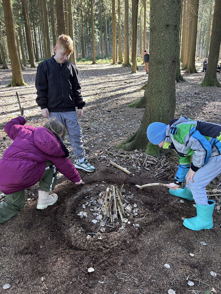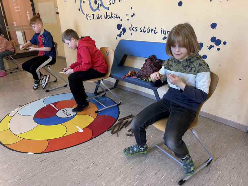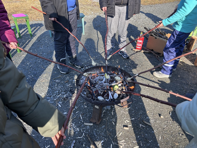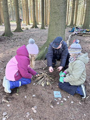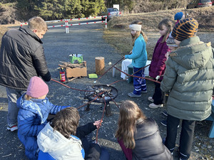 Die Klasse 4a durfte vom 19. - 23.01.2026 das Werteprojekt zum Thema "Feuer" erleben. Es war eine sehr erlebnisreiche und wissenswerte Woche. Trotz der eisigen Temperaturen haben wir im Wald gefrühstückt und gespielt. Zum Aufwärmen haben wir verschiedenen Zunder gesammelt, ausprobiert was davon am besten brennt und anschließend mit Hilfe eines Feuerstahls gemeinsam ein Lagerfeuer entfacht. Beim Waldfrühstück durften wir diesmal am Feuer Würstchen und Marshmallows grillen. Das war sehr lecker! Unsere Kohlezeichnungen aus der selbst hergestellten Kohle und die geschnitzten Buttermesser können sich auch sehen lassen. Zusätzlich stand ein Besuch bei der Feuerwehr auf dem Programm.
