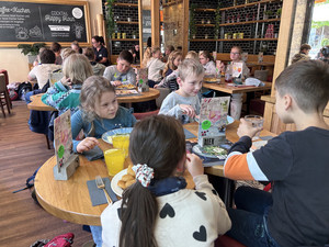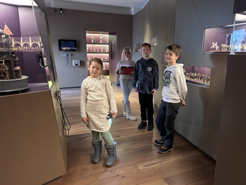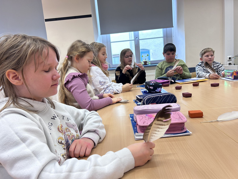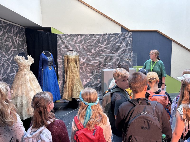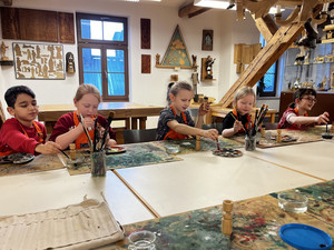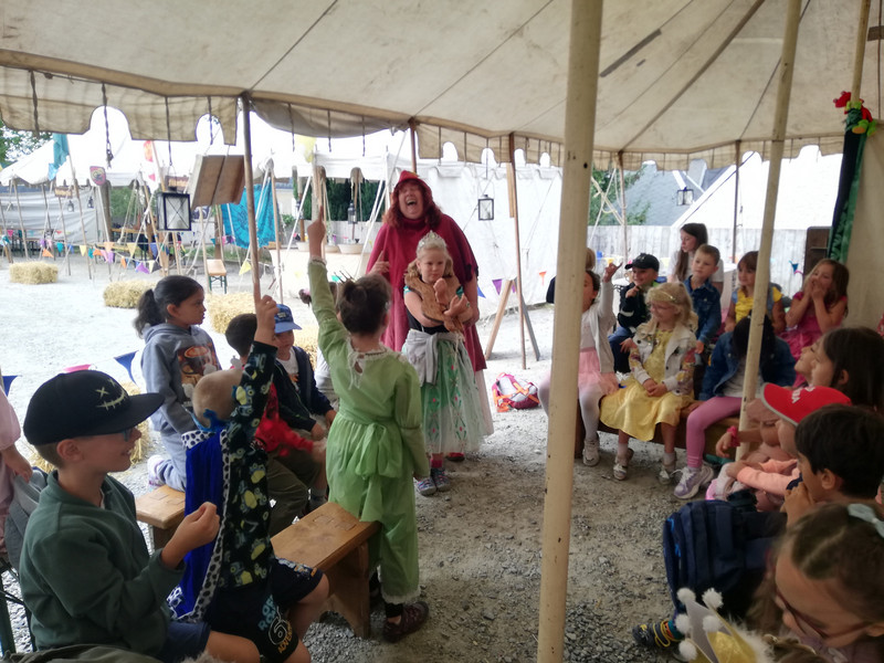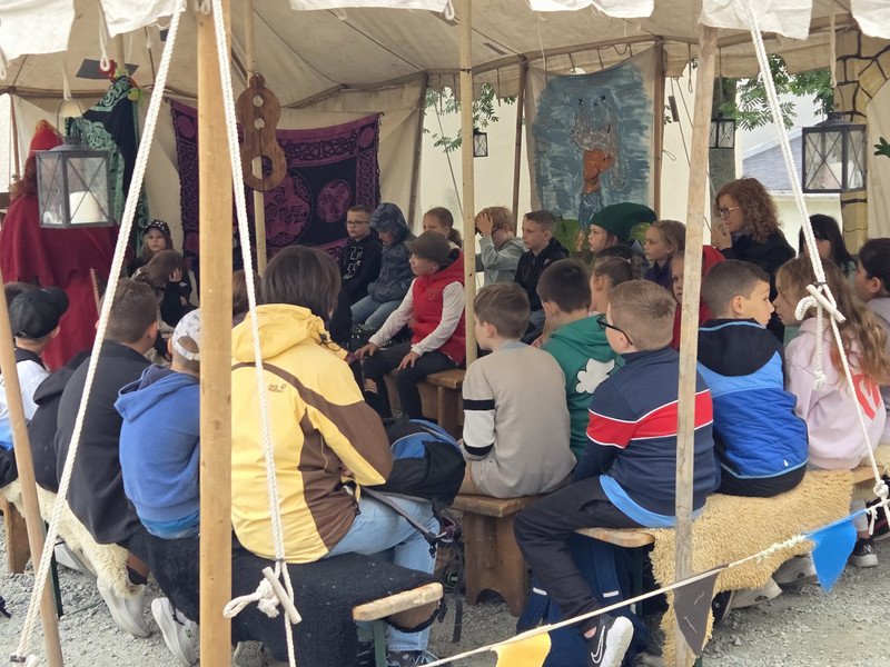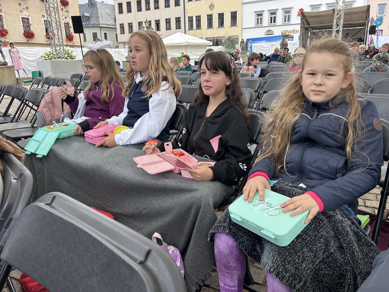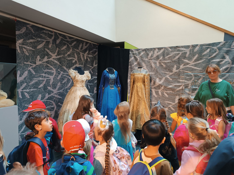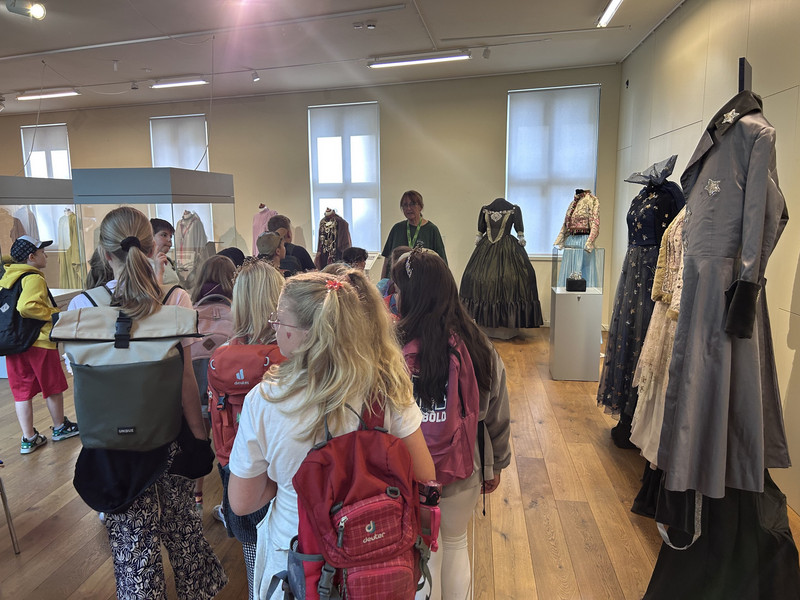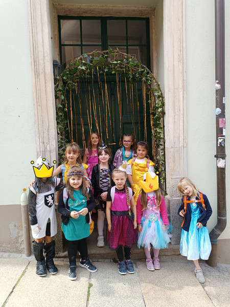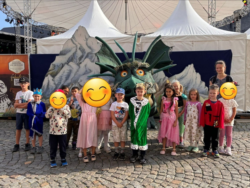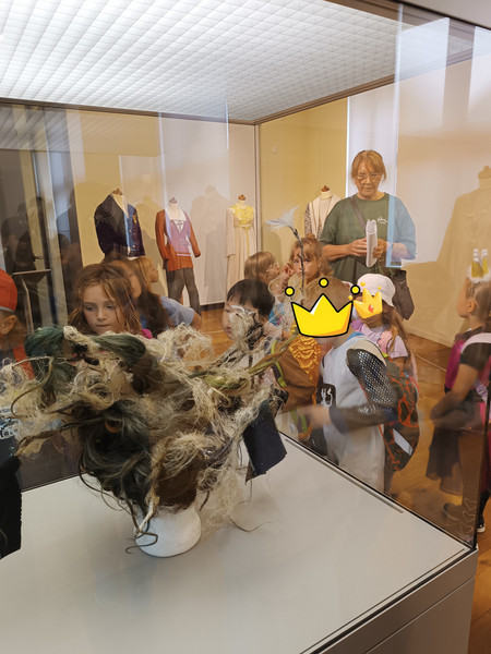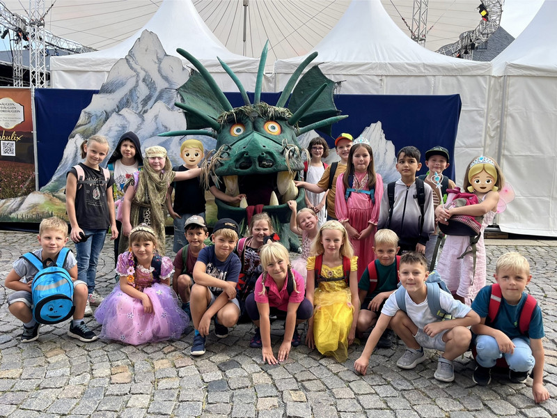 Am Donnerstag machte sich die Klasse 1b zu einem zauberhaften Ausflug ins Märchengetümmel auf. Zuerst besuchten sie die Kostümausstellung im Erzhammer zu den Märchen "die kleine Meerjungfrau" und "Der Stern Proxima". Besonders spannend waren die Kostüme des dunklen Königs und die Perücken der Meermenschen. Anschließend besuchte die 1b die Märchenerzählerin in ihrem Zelt. Sie berichtete von einem Holzfäller, der 3 Wünsche erhält. Dabei geht leider etwas schief und statt nun reich mit Kindern und Frau in einem Schloss zu wohnen, gibt es nur ein Würstchen in der Suppe. Außerdem lernten die Kinder den HausMausLausSchmausStrauß-Reim.