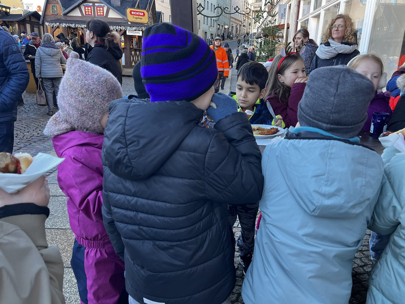 Am Montag ging es zur Mittagszeit auf den Weihnachtsmarkt, wo gemeinsam Kinderpunsch geschlürft und Bratwurst gefuttert werden konnte. Und auch am Dienstag wartete ein weiteres Highlight: Polternd betrat der Weihnachtsmann das Klassenzimmer! Doch er lobte die Klasse und hatte am Ende für alle tolle Geschenke dabei.