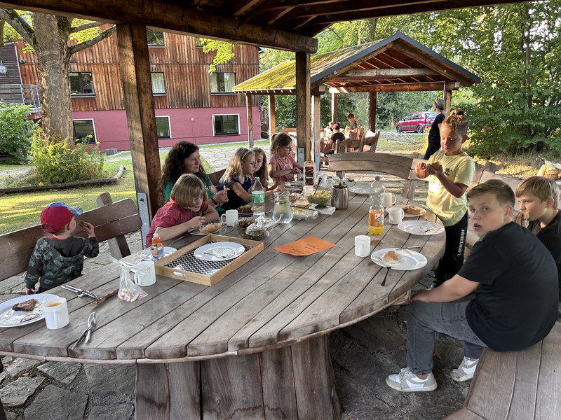 Nachdem die Kinder die Zimmer bezogen hatten, begaben sich die einzelnen Gruppen auf die Waldrallye, abends wurde gegrillt und mit Einbruch der Dämmerung startete die Nachtwanderung. Am nächsten Tag erkundeten wir unter der Leitung des FÖJ-ler Silas den nahegelegenen Wald, fanden Tierspuren und lernten viel über einheimische Pflanzen. Nachmittags galt es, in Teamarbeit verschiedene Abenteuerspiele und Aufgaben zu bestehen und zu lösen. Am Abend grillten wir süße Marshmallows über der Feuertonne und am nächsten Morgen fuhren uns die Eltern wieder zum Bildungszentrum zurück.