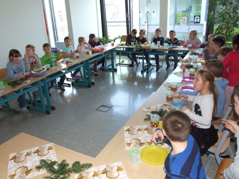 Am 18.12. fand die Weihnachtsfeier der Klasse 1b statt. In der Schulküche wurden leckere Plätzchen gebacken und hübsch verziert, im Klassenzimmer konnten die Kinder gegeneinander und miteinander bei Spielen wetteifern und im Anschluss wurden die selbstgebackenen Kekse verspeist. Nach einem kleinen Spruch oder Lied für den Weihnachtsmann bekam jeder Schüler sein Weihnachtsgeschenk überreicht. Ein Dankeschön geht an alle helfenden Wichtel.