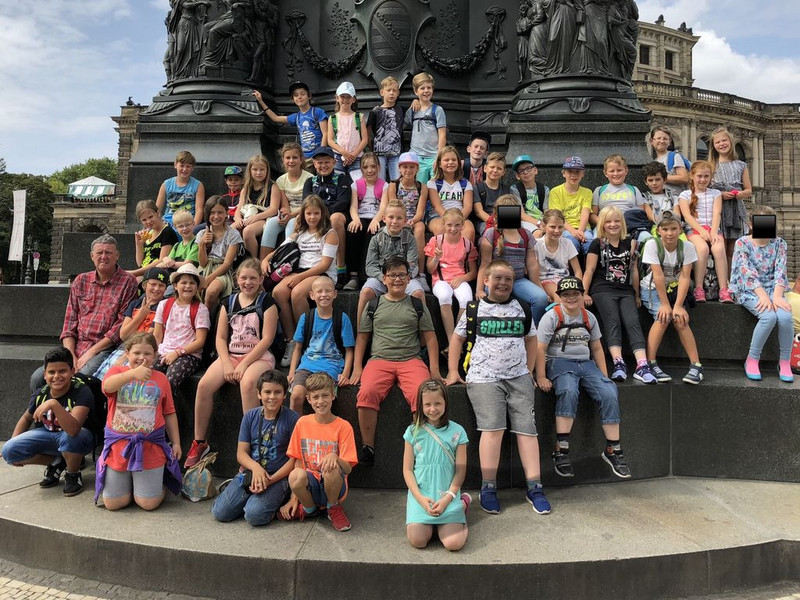 Die Klassen 4a und 4b waren am 21. August 2018 in Dresden. 8:00 Uhr fuhren wir mit dem Bus los. Als erstes waren wir im Hygiene-Museum. Dort gab es viel zu entdecken, lernen und man konnte auch viele Sachen ausprobieren. Zum Mittagessen waren wir bei McDonalds. Danach haben wir einen Stadtrundgang gemacht und sind in die Frauenkirche gegangen. Dort mussten wir ganz leise sein, weil es ein Gotteshaus ist. Vor der Frauenkirche waren verkleidete Menschen, die Spaß mit uns gemacht haben. Vor dem „Goldenen Reiter“ haben wir ein Gruppenfoto gemacht. Auf dem Weg zum Bus sind wir durch den Zwinger gelaufen. Gegen 18:00 Uhr waren wir wieder zu Hause. Es war ein anstrengender, aber schöner Tag.