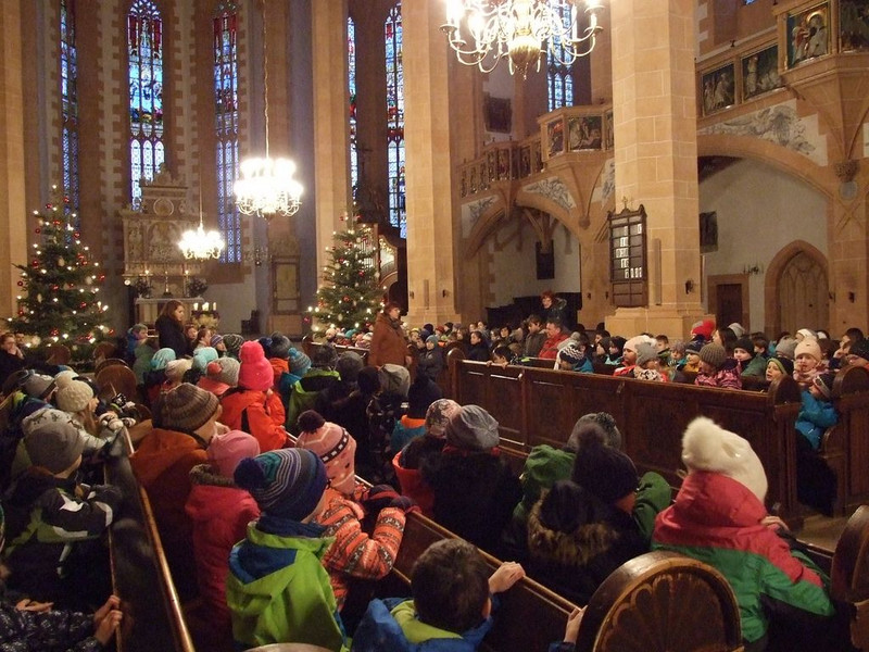 Begrüßung: Wir treffen uns nun schon seit einiger Zeit in der letzten Schulwoche, um uns in diesem schönen Gotteshaus auf die Weihnachtszeit vorzubereiten. Jede Klasse hat etwas vorbereitet und es beginnt der Chor. Nun hören wir die Klassen 1a und 1b mit dem Lied „0h Tannenbaum" (2 Strophen).