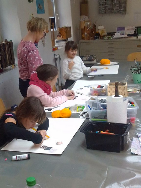 Frau Sachs überlegt sich, in welche Richtung die Kunstwerke der Kinder gehen sollen und zeigt ihnen anschließend, welche Techniken diesbezüglich angewendet werden können.