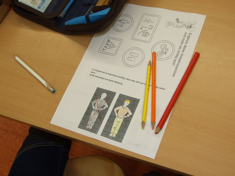 U.a. wurde das Verhalten beim Busfahren und an der Haltestelle wiederholt, das richtige Überqueren der Straße und die Regeln am Zebrastreifen waren Thema. Gemeinsam vervollständigten die Schüler wichtige Verkehrszeichen und malten die falsche bzw. die richtige Kleidung auf, die es in der jetzigen Jahreszeit zu tragen gilt. Als Geschenk gab es ein Reflektorband, welches neben unseren hellgrünen Warnwesten auch zur Sichtbarkeit im Straßenverkehr beiträgt.