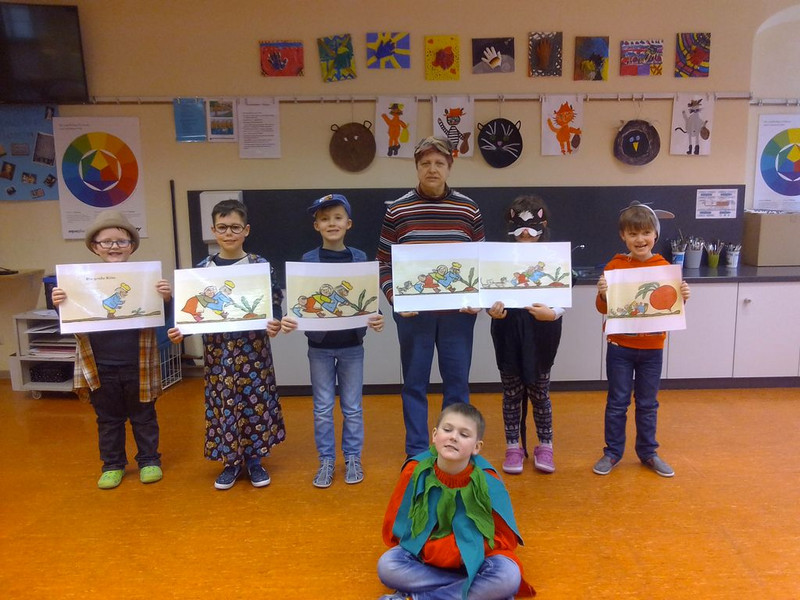 Die Laienspielkinder Julen (1b), Mio (1b, krank), Ondrej (1b, neuer Schüler), Kassy (2a), Felix (2a), Elias (3b) und Dominic (4a) haben viel Spaß beim Spielen der alten russischen Geschichte: „Die große Rübe“.