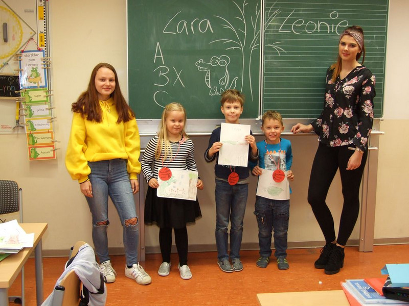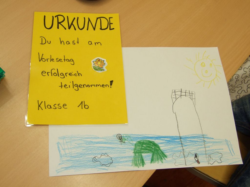 In den 8 Klassen der Grundschule stellten sich jeweils 2 - 3 Schüler der Klasse 9b vor. Die Oberschüler haben für jede Klasse jeweils 1 Buch zum Vorlesen und Vorstellen vorbereitet. Im Vorschulkindergarten des Bildungszentrums lasen dann die Schüler der Klasse 4a den Kleinen etwas vor. Für die Vorleser gaben es als Dankeschön eine Urkunde und einen Kuchen, den das GTA „Hexenküche“ und Frau Oertel vorbereitet hatten. Vielen Dank!
