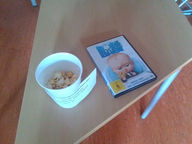 Ab 14:00Uhr startete im Kunstzimmer für die Kinder des Ganztagsangebotes Bibliothek ein Film der Wahl. Einstimmig wurde der Animationsfilm „The Boss Baby“ ausgewählt.