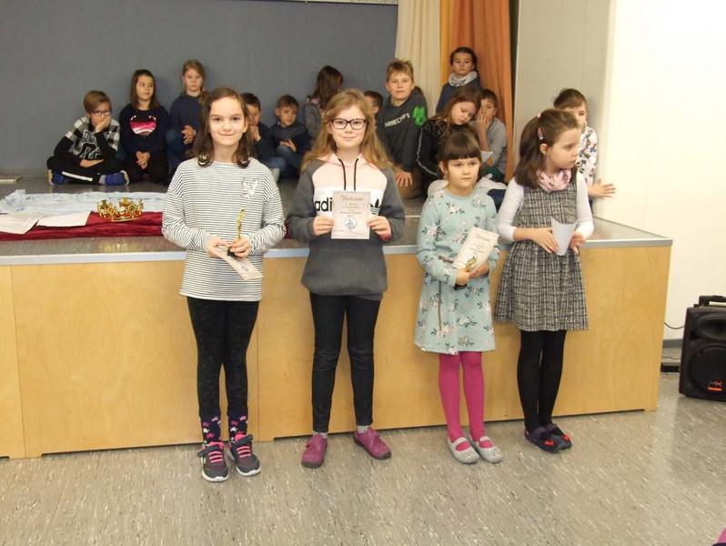 Einen "märchenhaften" Aulatreff gestaltete am 20.Januar die Kl.3b. Neben Winterliedern führten die Drittklässler das Märchen "Die goldene Axt" und die unterhaltsame Variante von "Aschenputtel" auf. Auch ein Gedicht in erzgebirgischer Mundart hatten die Schülerinnen eingeübt. Bei der Auswertungen der aktuellen Wettbewerbe standen diesmal die Teilnehmer des Informatikwettbewerbs und der Matheolympiade im Mittelpunkt.