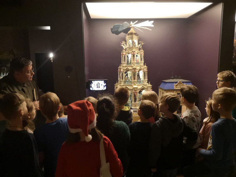 Am 10.12. begaben sich die Kinder der Kl.2b auf die Suche nach dem Museumskobold. Dieser hatte sich nämlich in der Manufaktur der Träume versteckt. Zu Gesicht bekamen die Kinder ihn zwar nicht, aber er hatte Spuren hinterlassen und eine süße Schatztruhe. Nebenbei entdeckten die Kinder alte Holzspielsachen, erzgebirgische Pyramiden oder Leuchter und viele andere Dinge. Beim anschließenden gemütlichen Beisammensitzen und Plätzchenessen warteten alle ganz gespannt auf den Weihnachtsmann. Als dieser kam, wurde gesungen, Flöte gespielt, Gedichte aufgesagt und ein Weihnachtsgeschenk gab es natürlich auch.