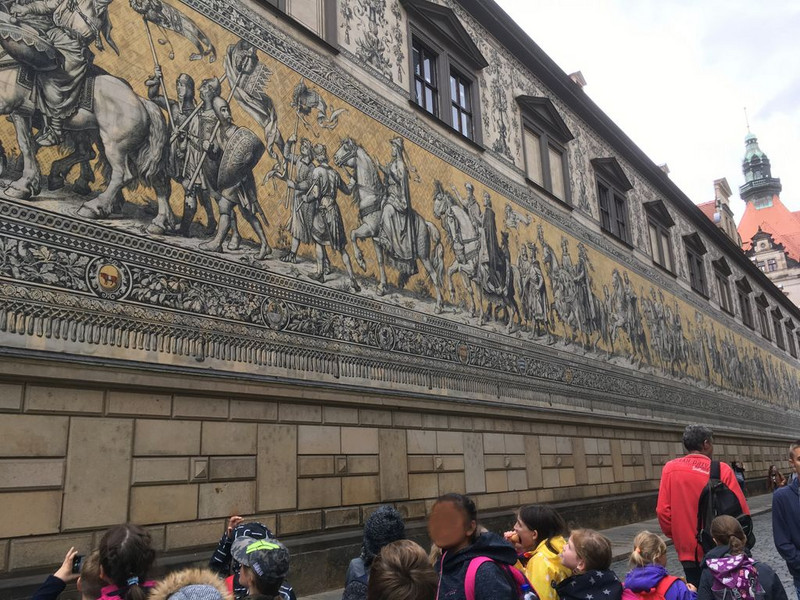 Danach fuhren wir mit dem Bus weiter zur Frauenkirche, die wir uns auch innen ansahen und ganz schön staunten. Später kauften wir uns alle ein leckeres Eis. Anschließend haben wir uns den Fürstenzug angesehen und viele haben sich ein kleines Souvenir gekauft.