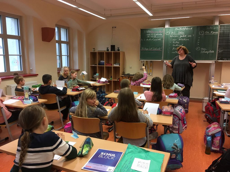 Am 02.10. und 10.10.2019 fand das Modellprojekt „Schreibmobil: Die mobile Schreibwerkstatt - Schreib Deine eigene Geschichte!“ in den Klassen 4 statt. Ein Angebot interessanter Schreibanregungen und –anlässe soll die Kinder zum selbstständigen Schreiben motivieren und sie auf verschiedenen Niveaus zum Umgang mit eigenen Ideen herausfordern. Frau Claudia Puhlfürst kam aus Zwickau angereist um die Kinder zu coachen. Der Schreibprozess wird durch den Coach in allen Phasen unterstützt: bei der Entwicklung eigener Ideen, beim Finden von Schreibzielen, beim Planen und Recherchieren, beim Schreiben selbst und beim Überarbeiten.