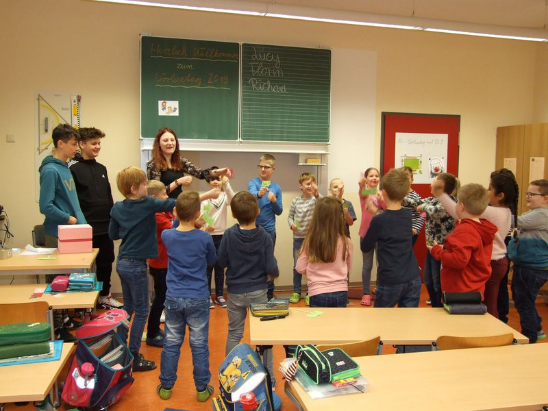 Das diesjährige Vorlesefest stand unter dem Motto „Sport und Bewegung“. In jeder Klasse wurde jeweils ein Buch vorgestellt und ein Abschnitt vorgelesen. Dabei sind gezielt Bücher ausgewählt worden, die zum Jahresmotto passen und es wurden mit den Schülern auch Bewegungsübungen gemacht. Im Anschluss gab es noch eine kleine Aufgabe und da war auch schon eine Unterrichtsstunde vorbei.