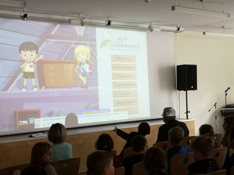 Der Aulatreff im Monat November, moderiert von der Klasse 4b, war ein besonderer mit prominenten Gästen. Es wurde nämlich die neue DVD "Mein Erzgebirgskreis" vorgestellt, ein Unterrichtsfilm für den Sachunterricht. Die Schüler erfuhren, dass es ein langer und aufwändiger Weg ist, von der Planung bis zur Veröffentlichung eines solchen Films. Und natürlich durften die Grundschüler auch schon mal im Filmkapitel "Glück auf" probegucken.