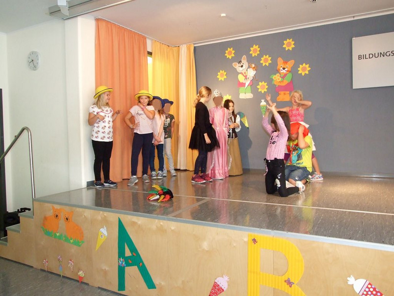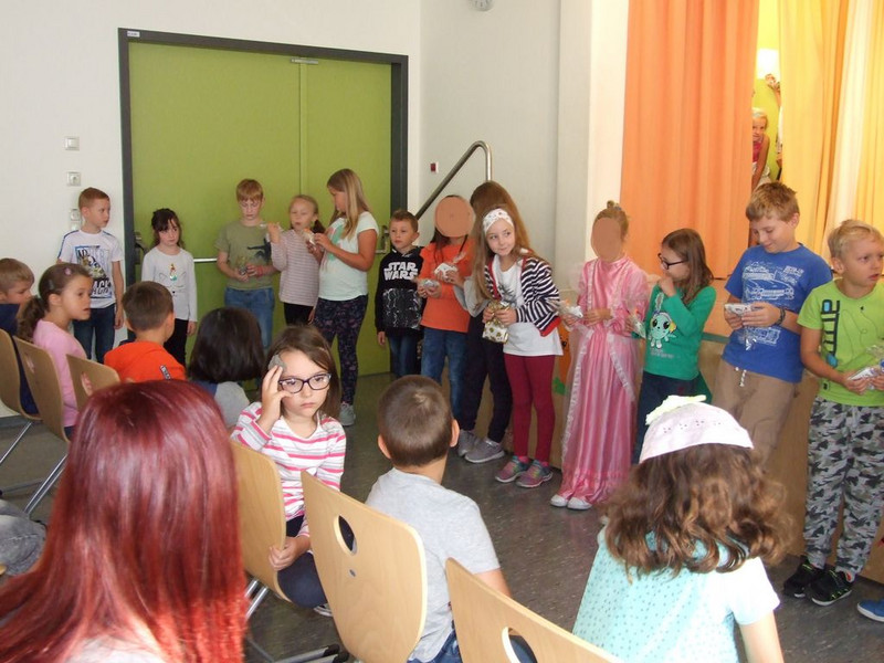 Nun durften auch wieder die Geburtstagskinder nach vorn kommen und wir summten ihnen ein kleines Ständchen. Zum Abschluss führten für uns einige Zweit- und Drittklässler "Ein Märchen einmal anders - Wer ist eigentlich Schneewittchen?" auf. Mit viel Fleiß hat Frau Kästner das Stück im Ferienhort mit den Kindern eingeübt. Trotz Lampenfieber bei den kleinen SchauspielerInnen war es eine gelungene Aufführung.