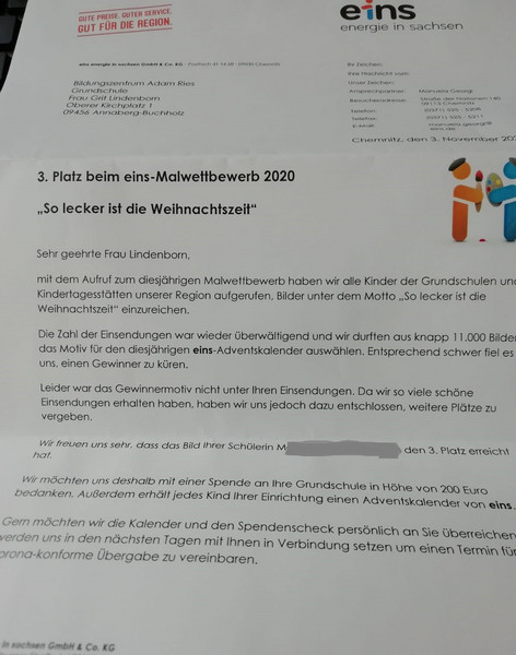 Der 3.Platz ging unter insgesamt 11000 !! Einsendungen an unsere Schülerin M. aus der 4.Klasse. Damit ist auch eine Spende an unsere Grundschule in Höhe von 200 Euro verbunden. Die Übergabe erfolgte am 27.11. und Frau Emmrich nahm den Scheck stellvertretend in Empfang.