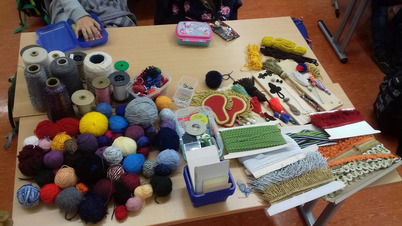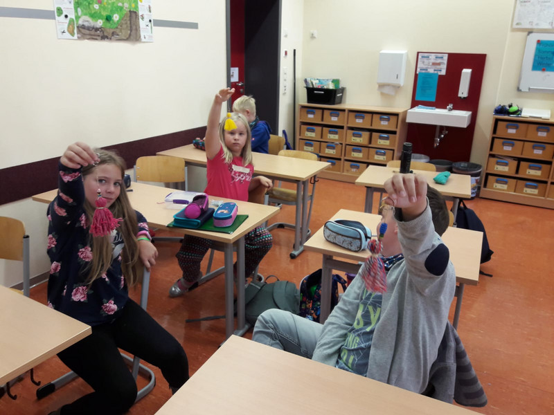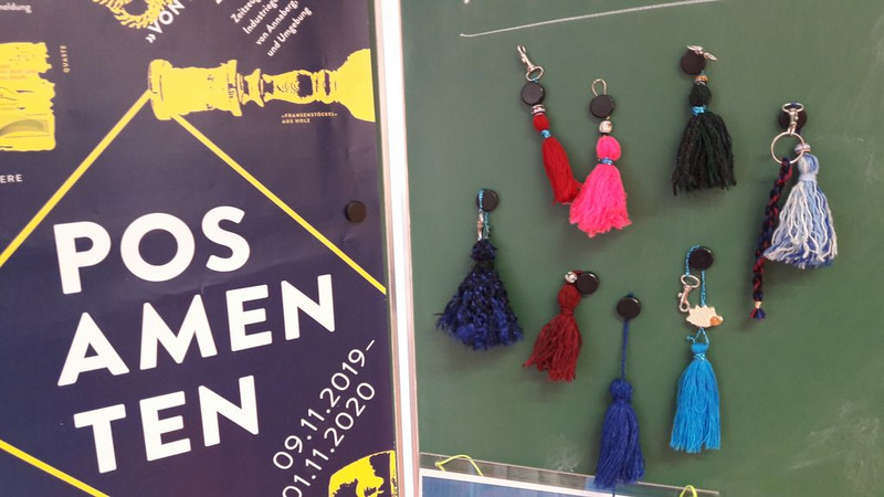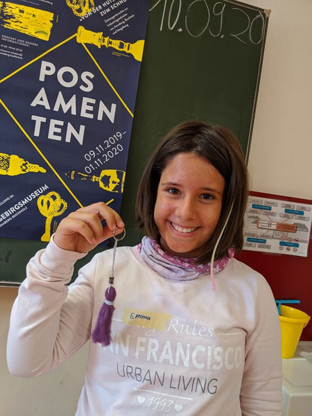 Die Theorie wurde dann im Klassenzimmer gleich in die Praxis unter fachmännischer Anleitung umgesetzt. Alle Kinder, egal in welchem Alter, waren mit Begeisterung dabei, ihre eigenen Posamenten herzustellen und dann natürlich richtig stolz auf ihre tollen Produkte, wie beispielsweise die obigen Quasten.