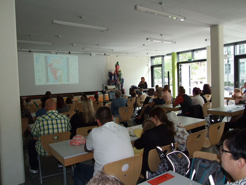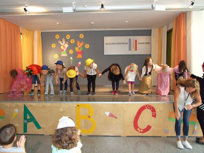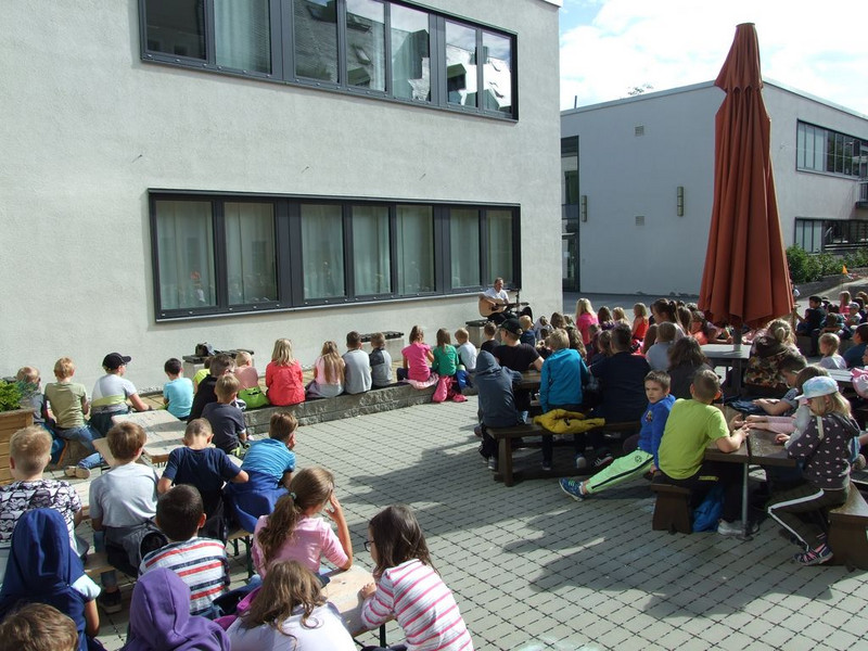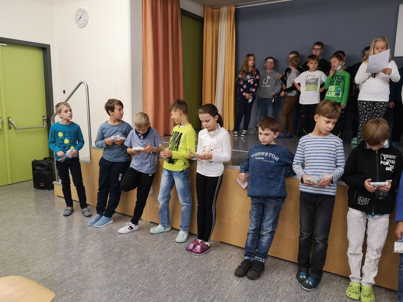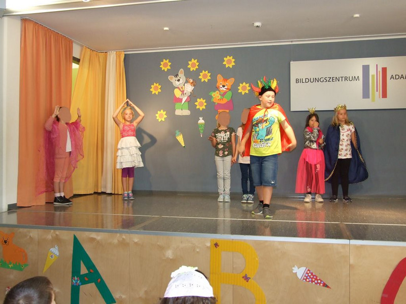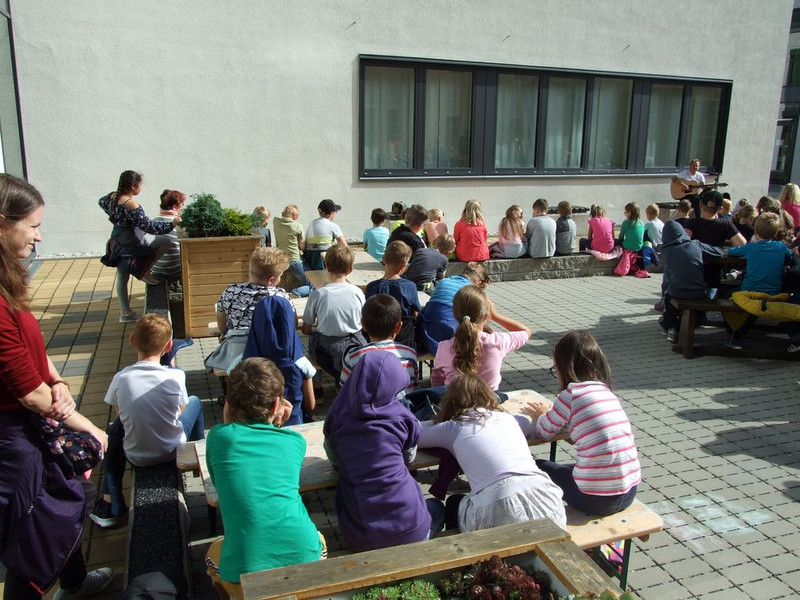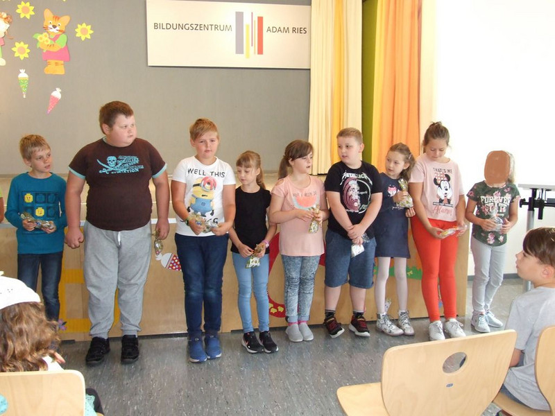 Unser kleines Schulfest begann mit dem Aulatreff. Nach dem Aulatreff und einem gesunden Frühstück mit Schulobst bastelten und knobelten die Kinder mit ihren Erzieherinnen und LehrerInnen im Klassenzimmer. Ganz im Sinne von Adam Ries wurden auch knifflige Matheaufgaben gelöst. Bei unserer Schultombola haben sich alle Schüler einen kleinen oder größeren Preis abholen können. Der Vormittag ging bei schönem Wetter mit einem Konzert auf dem Schulhof zu Ende.