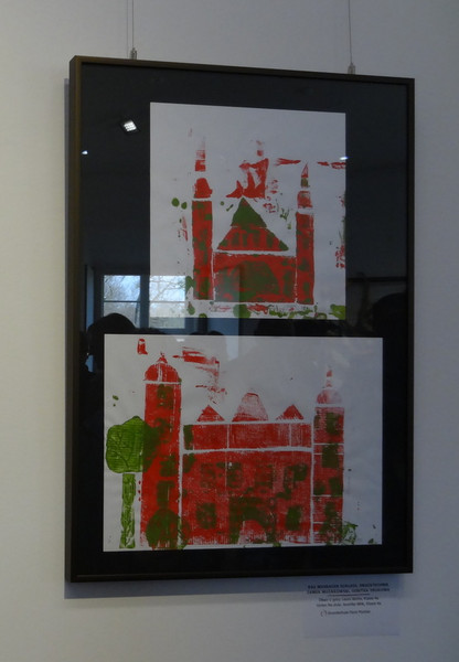 Im Unterricht werden die Skizzen dann zu Tuschebildern, Grafiken oder Drucken weiter bearbeitet. Zu sehen sind zweifarbige Drucke von Schloss und Brücken. Vielleicht erkennt ihr die ein oder andere Parkbrücke wieder?!