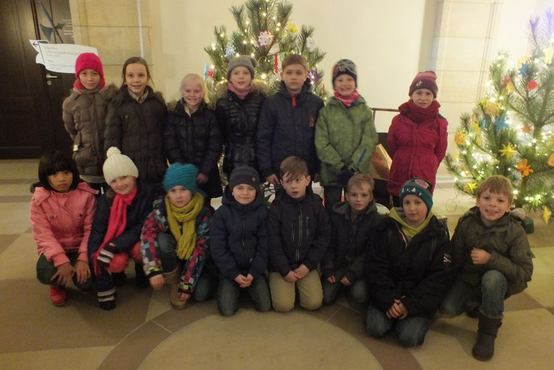 Kinder der Grundschule Fürst Pückler schmücken Weihnachtsbäume im Muskauer Schloss