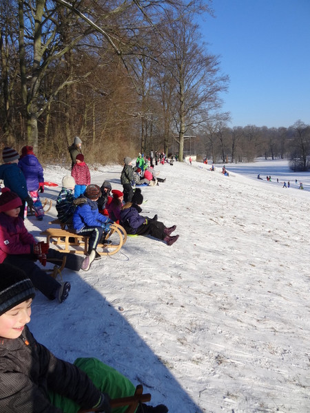 Rodeln auf der verschneiten Gloriette im Park am 22. Januar 2016