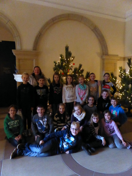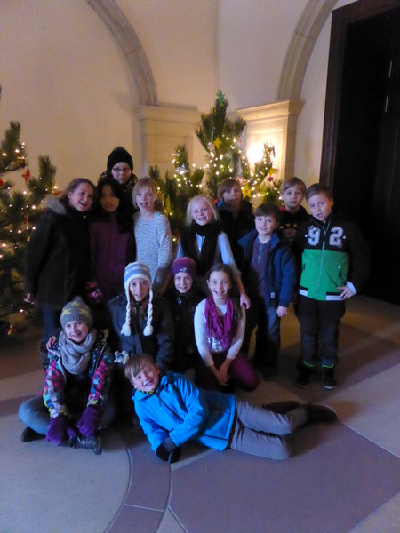 Die Kinder schmücken im Muskauer Schloss Weihnachtsbäume mit selbst gebastelten Kugeln, Sternen etc.