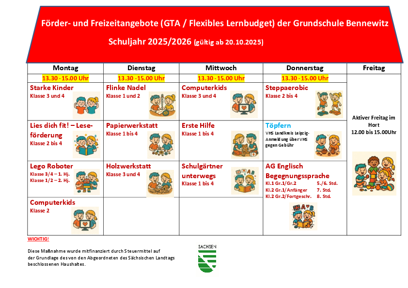 GTA Unsere Ganztagsangebote werden von Montag bis Donnerstag als geregelte Angebote durch die Grundschule und Externe abgesichert. Am Donnerstag und Freitag bietet der Hort offene, teilgebundene Angebote an.