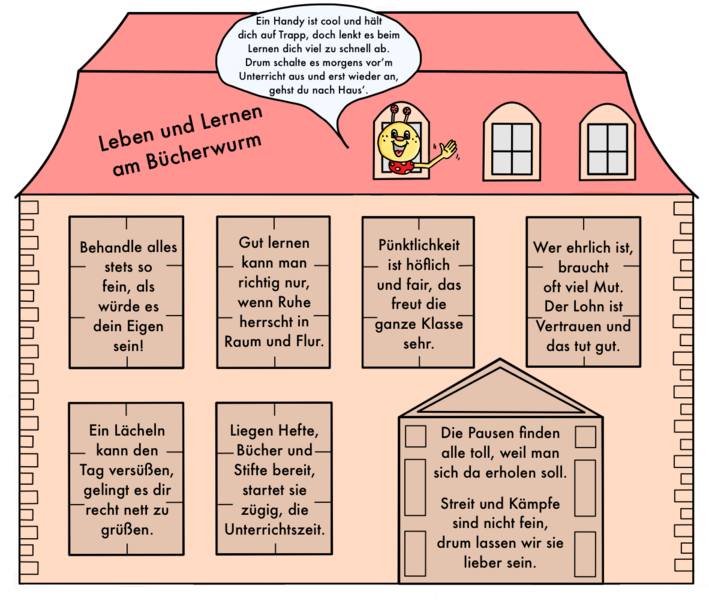 Damit jede am Schulalltag teilnehmende Person ungestört arbeiten und lernen kann und die Freude daran nicht verloren geht, gibt es an der Grundschule "Zum Bücherwurm" neben einer für das Schulgelände gültigen Hausordnung auch einen klassenübergreifenden Regelkatalog und einen kindgerechten Leitfaden für ein gutes Miteinander.