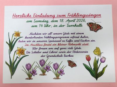 Am kommenden Samstag, den 13.04.2024 um 14 Uhr findet unser alljährliches Frühlingssingen statt. Nach dem bunten Programm unserer Schüler gibt es leckeren Kuchen und Kaffee im Speiseraum. Wir freuen uns auf zahlreiche Gäste!