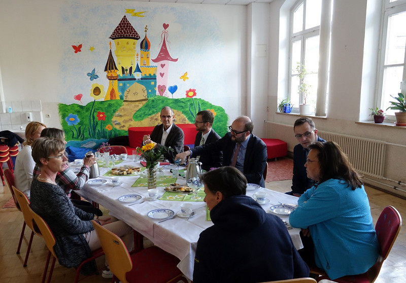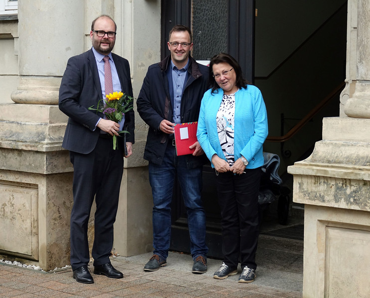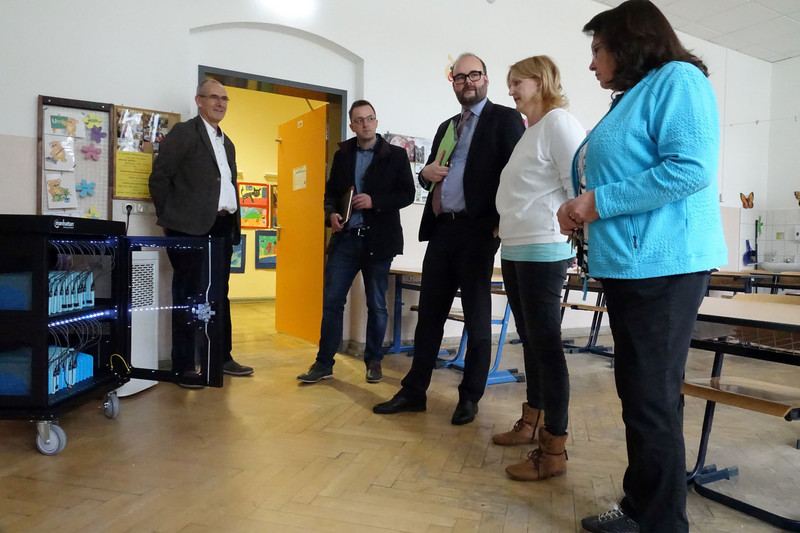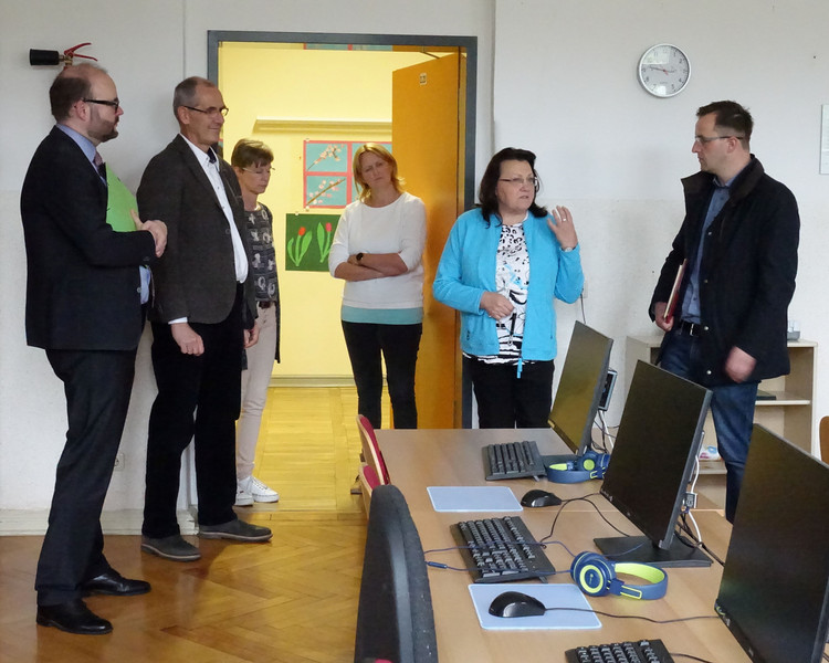 Kultusminister Christian Piwarz besuchte am 25. April 2024 während seines Aufenthaltes in Aue - Bad Schlema in Begleitung des Landtagsabgeordneten Eric Dietrich unsere Grundschule und verschaffte sich einen Überblick über die aktuellen Lehr- und Lernbedingungen. Bei einer Führung durch unser schönes Schulgebäude konnte er sich unter anderem ein Bild von den großen, freundlichen Klassenräumen, den hellen Fluren, den Fachräumen, der geräumigen Aula, unserer Schulbibliothek und der neuen Turnhalle machen. Auch über die technische, moderne Ausstattung mit den digitalen Tafeln, dem neuen Tabletwagen, unserem Computerkabinett und den Einsatz im Unterricht erkundigte er sich und kam anschließend mit uns Lehrern ins Gespräch.