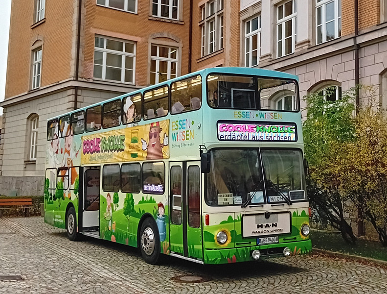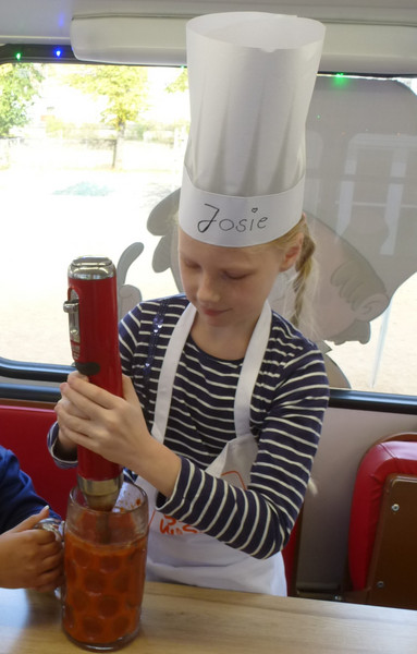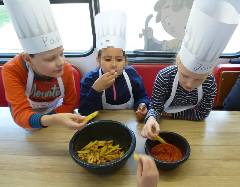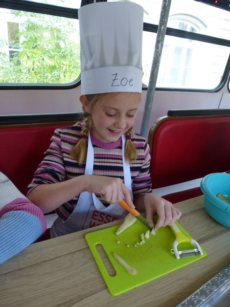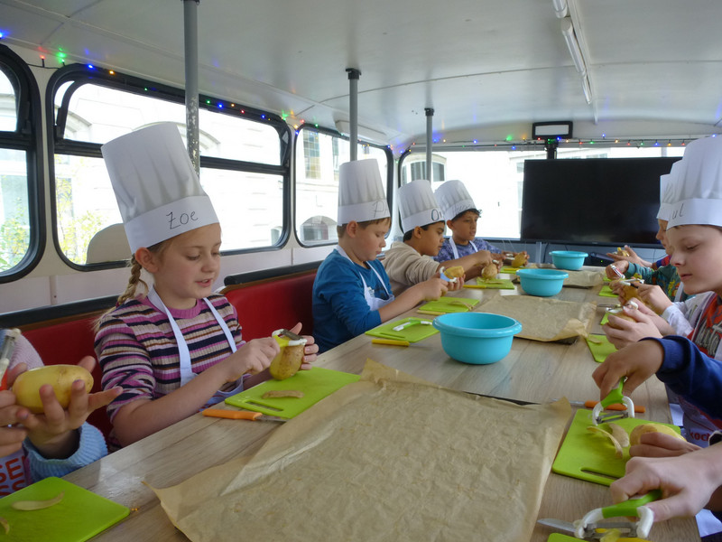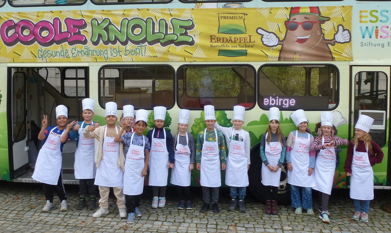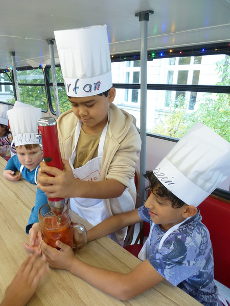 Schon vor dem Unterrichtsbeginn am Mittwoch, dem 23. 10. 2024, stand der herrlich beleuchtete Doppeldeckerbus auf unserem Schulhof und wartete auf die staunenden Kinder. Und dann ging es los. Ausgestattet mit Kochschürze und -mütze durften die kleinen Köche in fünf Gruppen im Laufe des Tages den Koch Michael Weise im Bus besuchen und selbst unter dessen fachkundiger Anleitung zum Kochlöffel greifen. So entstanden leckere Gerichte wie Kartoffeln und Quark, Stampfkartoffeln mit Gemüsepfanne, Kartoffelsuppe oder Pommes mit Ketchup. Die Kinder schälten wie die Weltmeister Kartoffeln, schnibbelten Gemüse, pürierten, schwangen den Rührlöffel oder stampften Kartoffelbrei. Das machte nicht nur unglaublich viel Spaß, sondern sie staunten auch, dass das Zubereiten von gesunden Gerichten gar nicht so schwer ist. Natürlich wurden die gekochten Speisen dann auch gemeinsam gegessen und hier waren die Kinder wieder überrascht. Es schmeckte nämlich auch noch super lecker. So fanden sie ihren selbst zubereiteten, gesunden Gemüseketchup viel besser als den „Gekauften“. Der ein oder andere kleine Koch nahm sich sogar ganz stolz vor, auch zuhause einmal die Eltern mit dem gelernten Kartoffelgericht zu verköstigen.