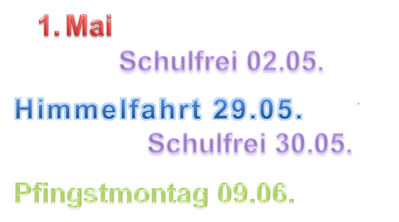 Ab Montag, 28.04.14 beginnt der Endspurt für dieses Schuljahr. Neben 3 Feiertagen und 2 beweglichen Ferientagen gibt es erst wieder zu den Sommerferien Mitte Juli frei. Bis dahin heißt es: Alles Klarmachen für die Zeugnisse und allen Prüflingen maximale Prüfungserfolge.