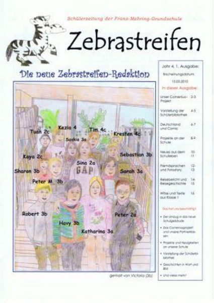 Ab heute kann die neue Schülerzeitung für 0,50 € erworben werden. Das Team um Frau Wieser und Frau Ullrich hat wieder viele interessante Artikel, Bilder und Geschichten zusammengestellt. 2009 wurde die Schülerzeitung mit dem 2. Platz beim Jugendjournalistenpreis ausgezeichnet. Bei Fragen und Anregungen kann man sich unter der E-mailadresse sz-zebrastreifen@web.de   bei den Redakteuren melden.