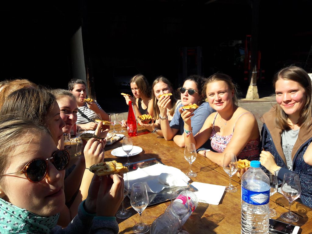 Aujourd’hui, on a visité le domaine de recherche viticole SICAREX au Beaujolais avec nos corres. Ce matin, on s’est rencontrés à l’école et après on a mis 30 minutes en bus pour y arriver. Après avoir fait une petite balade au vignoble et après avoir goûté les raisins, on a été répartis en deux groupes pour faire des activités différentes. Notre groupe a commencé à travailler sur les cépages, les arômes et la géographie viticole de la France. Après, on nous a montré la salle de production. Puis, on a changé avec l’autre groupe. Dans un atelier, on a fait des jeux sensoriels pendant lesquels on a pu tester nos cinque sens. À midi, il y a avait un mâchon beaujolais en plein air. Ensuite, on nous a montré la salle de stockage, le pressage des raisins et l’extraction du jus de raisin qu’on a pu goûter. À la fin de notre visite, on a acheté du vin et du jus de raisin comme souvenir de la région pour nos familles.Annika und Lia