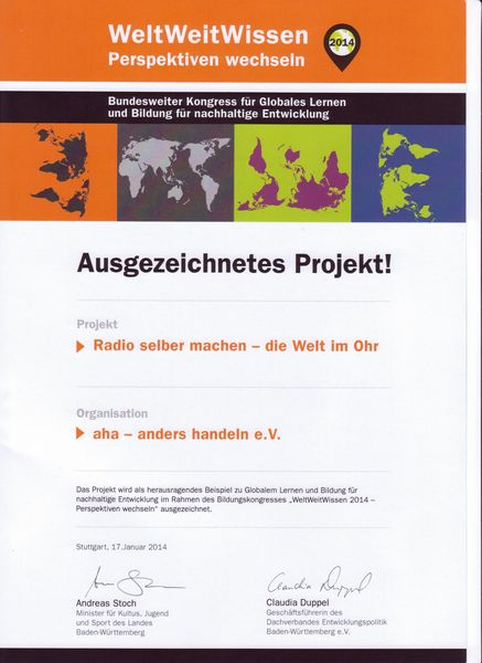 Auf einem bundesweiten Kongress: WeltWeitWissen in Stuttgart im Januar 2014 ist dieses Projekt ausgezeichnet worden!