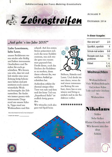 Der neue "Zebrastreifen" erscheint am 15. Dezember und kann für 50 ct erworben werden. Neben aktuellen Berichten aus dem Schulleben findet ihr auch Rezepte zur Weihnachtszeit, Rätsel und Geschichten, die euch das Warten auf den Weihnachtsmann verkürzen.