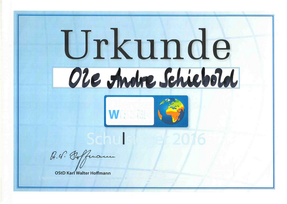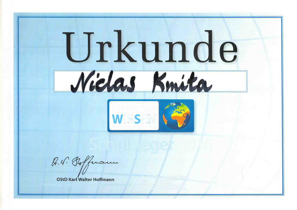 Rund 310 000 Schüler in Deutschland testen ihr Wissen. Alle Schüler unserer Schule ermittelten kurz vor den Winterferien ihren Klassensieger.  Hätten Sie´s gewusst: „größte Stadt (14 Mio EW) des Landes am Bosporus gelegen“? oder „In welche Himmelsrichtung fliegen die deutschen Spieler, wenn sie am Flughafen Frankfurt am Main starten und nach Frankreich zur Fußball-Europameisterschaft wollen?  Niclas Kmita aus der 6_2 und Ole Schiebold aus der 5_5sind mit 18 von 19 Punkten unsere SCHULSIEGER. Herzlichen Glückwunsch! Dr. H. Schubert