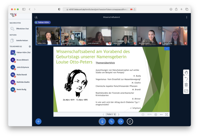 Von 18 Uhr bis 19:30 Uhr konnten Lehrer*innen, Schüler*innen, Kolleg*innen oder Eltern sich viele verschiedene Vorträge über spannende Themen anhören. Dabei führte uns Herr Hühn als Moderator angenehm durch den Abend. Ob zum Thema vegane Ernährung, Pompeji oder der Forensik in amerikanischen Kriminalserien, an diesem Abend war für jeden etwas dabei. Alle Vorträge waren interessant und die Themen begeisterten mich sehr. Über 45 Teilnehmer*innen ließen sich dies nicht entgehen und traten dem Onlineraum bei. Ebenfalls unser Schulleiter Herr Loibl sowie unsere stellvertretende Schulleiterin Frau Eger waren voller Vorfreude und am Ende begeistert von der erstaunlichen Leistung der Akteur*innen. An diesem Abend wurde viel Wissen vermittelt und ich finde, dass die 9. Klassen einen guten Einblick in die anstehende Facharbeit bekommen haben. Außerordentlich gute, sehenswerte Vorträge spiegelten unsere Schule bestens wider. Louise Otto-Peters wäre bestimmt stolz darauf. Diesen außergewöhnlichen und erfolgreichen Wissenschaftsabend werden viele wahrscheinlich nicht so schnell vergessen.