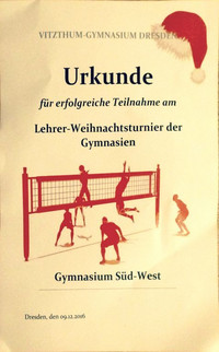 Am Freitag Abend hat sich eine Lehrer-Mannschaft unserer Schule erstmalig an dem traditionellen Lehrer-Volleyballturnier beteiligt. Mit viel Begeisterung und Einsatz waren wir definitiv die Mannschaft mit dem meisten Spaß am Spiel. Auch verletzungsbedingt in Unterzahl spielend, konnten wir den erfahrenen Mannschaften ordentlich Paroli bieten. Wenn wir im nächsten Jahr genauso erfolgreich spielen, wie wir Leidenschaft und Spielfreude gezeigt haben, ist uns der Sieg eigentlich nicht mehr zu nehmen ;-) Euer geschafftes, aber zufriedenes Volleyballteam