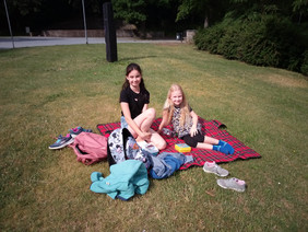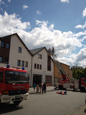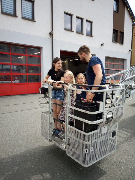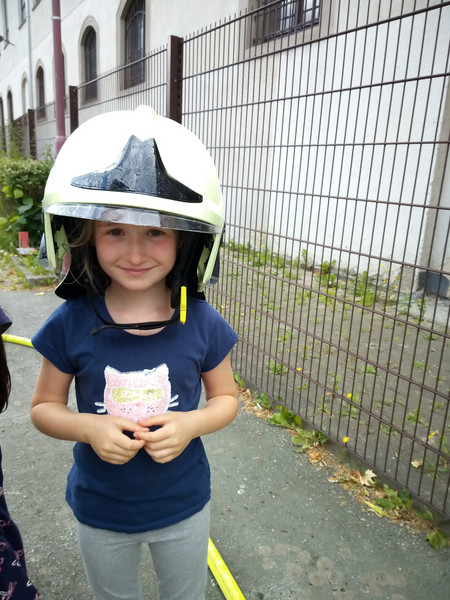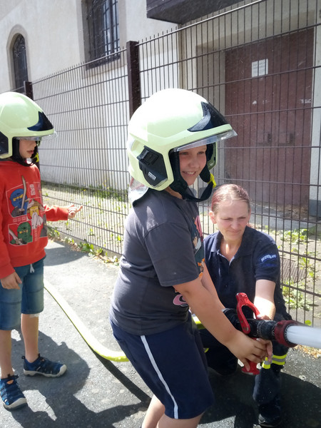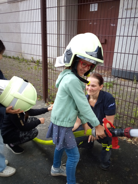 Einen unvergesslichen Tag erlebten die Kinder der Klasse 2 am Dienstag, dem 27. 06. 2023. Da sie sich im Unterricht mit den öffentlichen Einrichtungen ihrer Heimatstadt Aue beschäftigten, besuchten sie zuerst die Stadtbibliothek. Hier erfuhren sie viele interessante Dinge über die Arbeit und Abläufe in einer Bibliothek und konnten selbst in die Rolle einer Bibliothekarin / eines Bibliothekars schlüpfen. Natürlich blieb auch noch Zeit, um in den vielen Regalen zu stöbern und in einige Bücher hinein zu lesen. Viele Kinder fanden es hier so toll, dass sie sich ganz schnell als Nutzer der Bibliothek anmelden möchten. Nachdem sich dann bei einem Picknick am Carolateich gestärkt wurde, ging es bei einem kleinen Stadtrundgang vorbei an einigen wichtigen Plätzen und Gebäuden der Stadt zum nächsten Highlight - der Feuerwehr. Obwohl die Kinder diese schon oft vom Schulhof oder vom Klassenzimmerfenster aus beobachten konnten, war es doch etwas ganz Anderes, hautnah vor Ort zu sein. Viele spannende Dinge wurden von den Feuerwehrmännern berichtet und vorgeführt und alle staunten, was ein Feuwehrmann bei einem Einsatz alles anziehen muss oder was in so einem Feuerwehrauto für Geräte und Werkzeuge enthalten sind. Natürlich durften die Kinder auch einmal Probe sitzen. Zum Schluss hieß es dann noch: Helme auf und Wasser marsch! Und das Löschen mit richtig viel Wasser war gar nicht so leicht. Die ganz Mutigen durften anschließend sogar noch mit der Drehleiter in luftiger Höhe unsere Schule und den Schulhof von oben bewundern. Was für ein tolles Erlebnis!