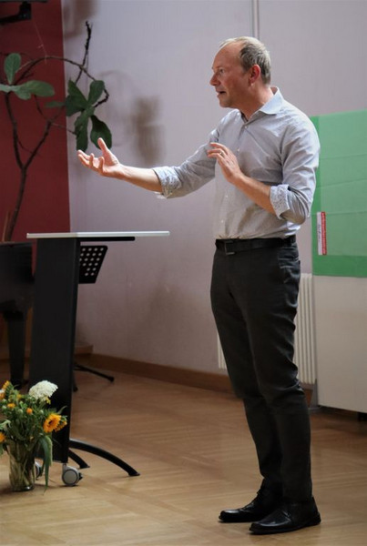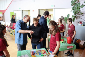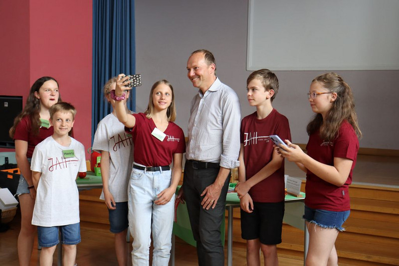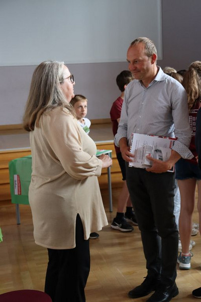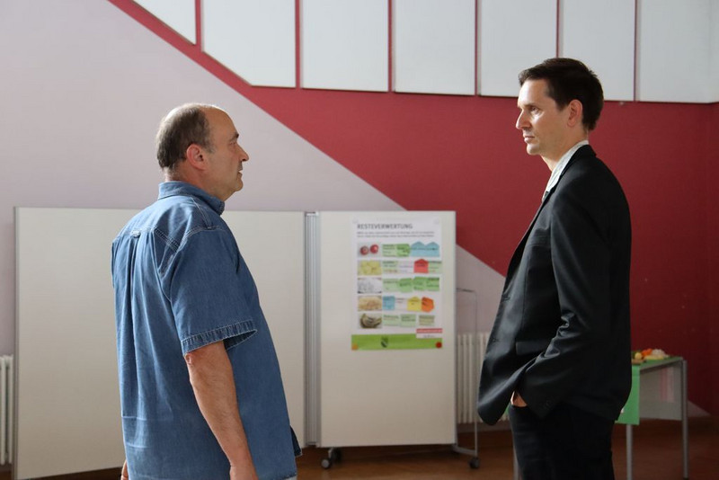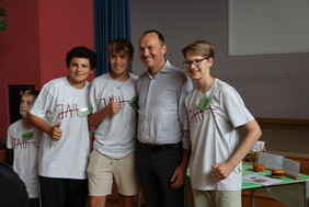 Am Mittwoch der letzten Schulwoche, 13. Juli 2022, konnte unsere Schulleiterin, Frau Hiller, hohen Besuch im Hülße-Gymnasium begrüßen. Der sächsische Staatsminister für Energie, Klimaschutz, Umwelt und Landwirtschaft, Wolfram Günther, stellte mit seinem Besuch das Projekt "Modellschule für klimafreundliche Ernährung" Medien und Öffentlichkeit vor. Das Projekt ist auf Initiative der Verbraucherzentrale Sachsen e.V. (verantwortlich: Herr Eichhorst) im Schuljahr 2021/22 v.a. in unseren 7. Klassen durchgeführt worden (vgl. den vorigen Bericht Schulprojekt "Nachhaltige Ernährung").