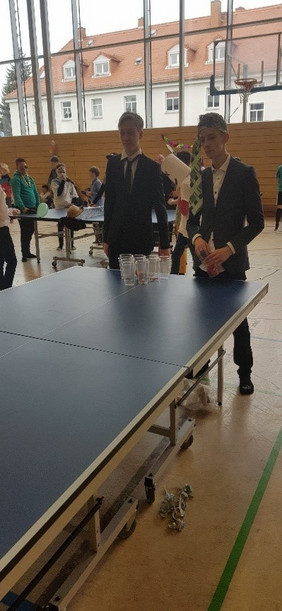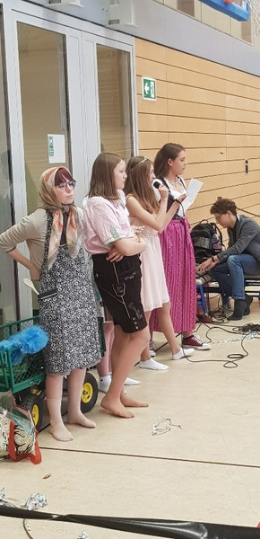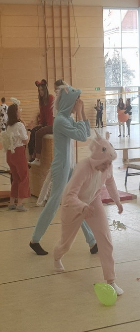Nach der Anmoderation, stürzten sich alle sofort ins Geschehen, wobei man Elefantenvolleyball, Gummibärchen-Ping-Pong, Badminton spielen oder einen Parcours bewältigen konnte. Nachdem alle eine Polonaise getanzt hatten, wurden die Preise für den Kostümwettbewerb in den verschiedenen Kategorien bekannt gegeben. Viele kreative und teilweise auch selbstgemachte Kostüme waren zu sehen. Mein persönlicher Favorit war eine Milka Schokolade, die sogar einen Preis ergattern konnte. Auch für die Verpflegung war, in Form von hunderten von Pfannkuchen gesorgt. Um die Musik und die nötigen Mikrofone kümmerte sich während der ganzen Veranstaltung die Technik AG unseres Gymnasiums.