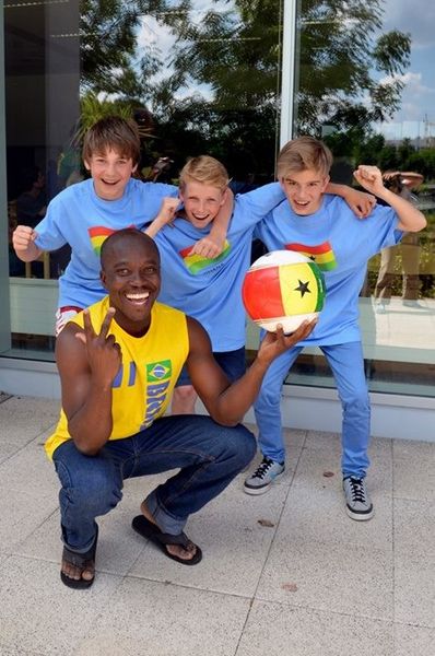 nein, auch in Leipzig! Am 18.06.2014 fand im Sportgymnasium die Auslosung zur Mini-WM der Schulmannschaften statt. Von Losfee Joachim Streich erfuhren wir nicht nur, wie es sich anfühlte in Wembley für sein 100. Länderspiel geehrt zu werden, sondern bekamen durch seine Hand auch unsere „Nationalität“ zu gelost – GHANA. Wie der Zufall es wollte, weilte Samuel Richard Marcourt, ein ghanaischer Fußballtrainer aus dem Internationalen Trainerkurs der Uni Leipzig unter den Anwesenden. So erhielten also unsere Vertreter Tom Nestler, Phillip Köhler und Theo Wolf die Nationaltrikots und den Spielball aus seiner Hand. Und wenn schon ein Trainer aus Ghana vor Ort weilt, bedurfte es keiner großen Überzeugungsarbeit, ihn für ein Training seiner Nationalmannschaft zu gewinnen. Mannschaftsbetreuer C.Gottlieb